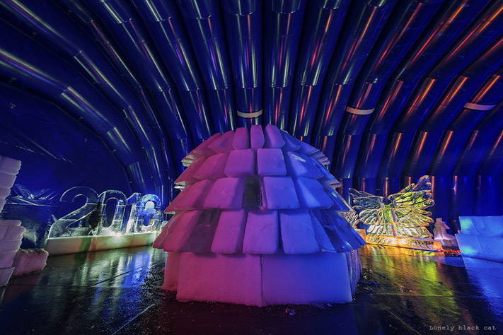 Перед специалистами компании "Вектор" стояла задача создать темное пространство внутри помещения. Поэтому пневмокаркас выполнен из темной ПВХ ткани. И только укрывной чехол белого цвета. Благодаря толщине стенки в два метра, здание удерживает нужную температуру внутри помещения. А это необходимое условия для работы выставки ледяных скульптур.