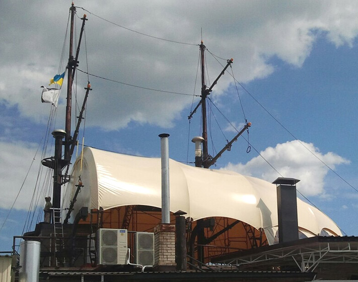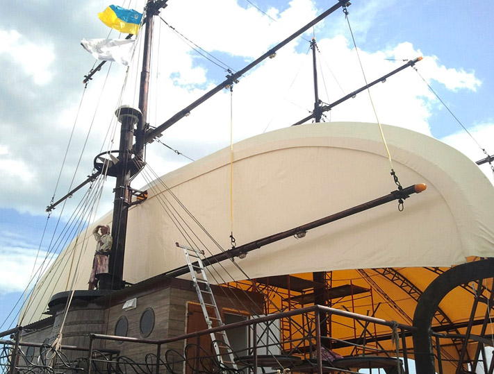 Перед специалистами компании стояла задача сохранить стилистику заведения и, с помощью линий шатра, дополнить форму пиратского корабля.